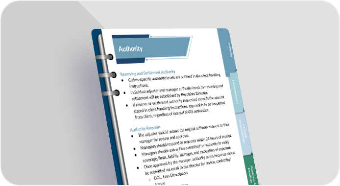 A Aut ut Authority hor hor i t y it y Reserving and Settlement Authority • Claims-specific authority levels are outlined in the client handling instructions. D • Individual adjuster and manager authority levels for reserving and oc um settlement will be established by the claims Director. ent • If reserve or settlement authority requested exceeds the amount a t i stated in client handling instructions, approval is to be requested on from client, regardless of internal NARS authorities. Authority Requests R • The adjuster should submit the original authority request to their es F p i ons n manager for review and approval. i an b c • Managers should respond to requests within 24 hours of receipt. i i l al i t i • Managers shouldreview files submitted for authority to verify es coverage, limits, liability, damages, and calculation of exposure. • Once approved by the manager, authority forms/requests should be submitted via email to the director for review, confirming: o DOL, Loss Description T D i o Venue ea m d el o Coverage verification i l nes i o Limits, deductibles nes s & o Attorney rep'd o Injured parties, type of injuries sustained o Liability/Negligence o Pertinent ISO results C o Damages –Specials (lost wages, medical)and General us t o Reserve/settlement amount requested om C l i er ent D & et 23 a i l Confidential, Proprietary and Trade Secret Document of NARS and protected by the Florida Uniform Trade s Secrets Act, chapter 688, Florida Statutes. No use allowed unless specifically authorized.