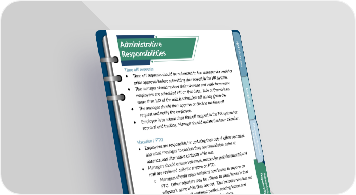 Administrative NA R S Responsibilities P r in c ip l e Time off requests s • Time off requests should be submitted to the manager via email for prior approval before submitting the request in the HR system. • Themanager should review their calendar and verify how many employees are scheduledoff on that date. Rule of thumb is no Co more than1/3 of the unit is scheduled off on any given day. m pl i • The manager should then approve or decline the time off a n c request and notify the employee. e • Employee is to submit their time off request in the HR system for approval and tracking. Manager should update the team calendar. P er f Vacation / PTO & Ror m eqa • Employees are responsible for updating their out of office voicemail n uc ie M r and email messages to confirm they are unavailable, dates of ema enn a absence, and alternative contacts while out. tg sem • Managersshould ensure voicemail, metrics (urgent documents) and en mail are reviewed daily for anyone on PTO. t o Managers shouldavoid assigning new losses to anyone on PTO. Otheradjusters may be utilized to work losses in that R ResAdA adjuster’s name while they are out. This includes new loss set esd ppmm up, contact with all pertinent parties, sending letters and onsonsinisin i is ibbtt correspondence, and establishing action plans. rr iliaa l t itit t iviv iesi • Managers shouldassist other managers while they are on ese e PTO. This includesmonitoring and managing voicemail, reviewing User Metrics, managingreserve and payment approvals, authority requests, and providing guidance and support to the staff. • Proactive management of tasks and assignments provides Y M continued support for customers while employees are oura W n out. Employeesshouldnot worry about returningto a work backlog. a or gi n 17 k g Confidential, Proprietary and Trade Secret Document of NARS and protected by the Florida Uniform Trade Secrets Act, chapter 688, Florida Statutes. No use allowed unless specifically authorized.