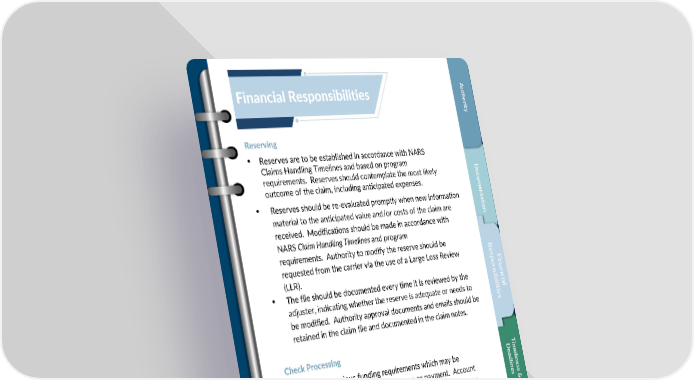A ut Financial Responsibilities hor i t y Reserving • Reserves are to be established in accordance with NARS Claims Handling Timelines and based on program D requirements. Reserves should contemplate the most likely oc outcome of the claim, including anticipated expenses. um • Reserves should be re-evaluated promptly when new information ent a t i material to the anticipated value and/or costs of the claim are on received. Modifications should be made in accordance with NARSClaim Handling Timelines and program requirements. Authority to modify the reserve should be RR ese requested from the carrier via the use of a Large Loss Review s FFin pp i (LLR). onson n anan is c • The file should be documented every time it is reviewed by the bib ic i al ial lil i tit i adjuster, indicating whether the reserve is adequate or needs to esie be modified. Authority approval documents and emails should be s retained in the claim file and documented in the claim notes. Check Processing T D i ea m • There are various funding requirementswhich may be d el i l nes requiredbased on amount of reserve or payment. Account i nes s handling Instructions and/or the client contract will address & funding requirementsand should be reviewed prior to completingfinancial transactions. • At no time should a check issuer also be the check printer and/or mail processor. C us • At no time should anyone issue a check to a vendor without a t om C l i 1099 or W9, without receiving and entering the information into er ent the C3. D & et 27 a i l Confidential, Proprietary and Trade Secret Document of NARS and protected by the Florida Uniform Trade s Secrets Act, chapter 688, Florida Statutes. No use allowed unless specifically authorized.