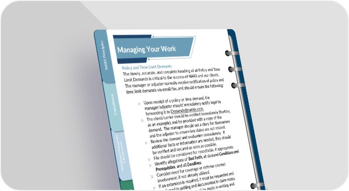 s e l ip c Managing Your Work in r P S R NA Policy and Time Limit Demands The timely, accurate, and complete handling of all Policy and Time Limit Demands is critical to the success of NARS and our clients. The manageror adjuster normally receive notification of policy and e time limit demands via email/fax, and should ensure the following: c n a i pl o Upon receipt of a policy or time demand, the m manager/adjustershould immediately notify legal by Co . forwarding it to [email protected] o Theclient/carrier should be notified immediately (Berkley, as an example), and be provided with a copy of the t demand. The manager should set a diary for themselves ens and the adjuster to ensure key dates are not missed. emt g a en o Review the demand and evaluation immediately. If n a em r additional facts or information are needed, they should e Mi c u n eq beverified and secured as soon as possible. a m & R o File should be considered for roundtable, if appropriate. or f er o Identify allegations of Bad Faith, all demand Conditions and P Prerequisites, and all Deadlines. o Consider need for coverage or defense counsel involvement, if not already utilized. e es o If an extension is required, it must be requested and iv i t t i l a i confirmed in writing and documented in claim notes. r b t i o All demand responses must be made in writing and is in ons documented in the claim file. m p d es o Managers should confirm appearances have been A R completed with documented proof in the claim file. NARS implemented a new process for managing demands in 12/2023, outlined in Effectively Handling Time Limit and Policy g k Demandstraining inNARS University. Process documents detail how n or new demands are routed, how diaries and metrics are established, gi a W n and how activity is monitored to ensure deadlines are met. a our M Y 22 Confidential, Proprietary and Trade Secret Document of NARS and protected by the Florida Uniform Trade Secrets Act, chapter 688, Florida Statutes. No use allowed unless specifically authorized.