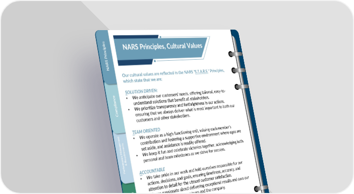 s e l ip NARS Principles, Cultural Values c in r P S R NA Our cultural values are reflected in the NARS "S.T.A.R.S." Principles, which state that we are: OLUTION DRIVEN: e S c • We anticipate our customers' needs, offering tailored, easy-to- n a i understand solutions that benefit all stakeholders. pl m • We prioritize transparency and forthrightness in our actions, Co ensuring that we always deliver what is most important to both our customers and other stakeholders. EAM ORIENTED t T ens • We operate as a high-functioning unit, valuing each member's emt g contribution and fostering a supportive environment where egos are a en n a em set aside, and assistance is readily offered. r e Mi c u • We keep it fun and celebrate victories together, acknowledging both n eq a m & R personal and team milestones as we strive for success. or f er P CCOUNTABLE A • We take pride in our work and hold ourselves responsible for our actions, decisions, and goals, ensuring timeliness, accuracy, and e es attention to detail for the utmost customer satisfaction. iv i t • We are passionate about delivering exceptional results and own our t i l a i r b t i commitments to both our team and the company. is in ons m p d ESPONSIVE A es R R • Weare fanatical about response times, consistently surpassing expectations through clear communication and diligent follow-ups. g k n or gi a W n a our M Y 6 Confidential, Proprietary and Trade Secret Document of NARS and protected by the Florida Uniform Trade Secrets Act, chapter 688, Florida Statutes. No use allowed unless specifically authorized.