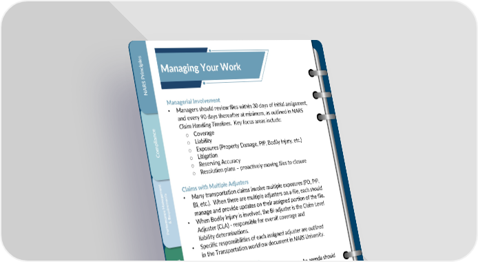 s e l ip c Managing Your Work in r P S R NA Managerial Involvement • Managers should review files within 30 days of initial assignment, and every 90 days thereafter at minimum, as outlined in NARS e Claim Handling Timelines. Key focus areas include: c n o Coverage a i pl o Liability m o Exposures (Property Damage, PIP, Bodily Injury, etc.) Co o Litigation o Reserving Accuracy t o Resolution plans – proactively moving files to closure ens Claims with Multiple Adjusters emt g a en • Many transportation claims involve multiple exposures (PD, PIP, n a em r e Mi BI, etc.). When there are multiple adjusters on a file, each should c u n eq a manage andprovide updates on their assigned portion of the file. m & R or f • When Bodily Injury is involved, the BI adjuster is the Claim Level er P Adjuster (CLA) - responsible for overall coverage and liability determinations. • Specific responsibilities of each assigned adjuster are outlined in the Transportation workflow document in NARS University. e es iv i t t i l a i r b t i Unit Meetings, One-on-Ones is in ons • Managers should have weekly teammeetings. An agenda should m p d es be included in the invitation to allow all employees to A R participate. Notes should be taken, maintained, and distributed. • Managers shouldconduct weeklyone-on-one meetings, for 15 – 30 minutes, with their employees. k o Topics may include performance trends and results, status g of metrics, employee development, etc. n or gi o Documentation should be retained for performance a W n trends, development goals, and general observations. a our M Y 20 Confidential, Proprietary and Trade Secret Document of NARS and protected by the Florida Uniform Trade Secrets Act, chapter 688, Florida Statutes. No use allowed unless specifically authorized.