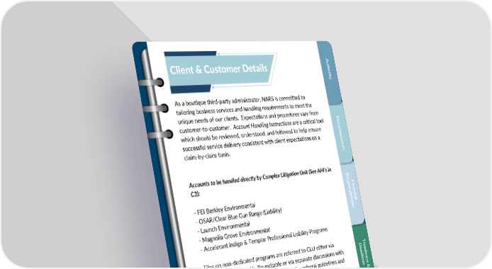 A ut Client & Customer Details hor i t y As a boutique third-party administrator, NARS is committed to tailoring business services and handling requirements to meet the unique needs of our clients. Expectations and procedures vary from D customer-to-customer. Account Handling Instructions are a critical tool oc which should be reviewed, understood, and followed to help ensure um successful service delivery consistent with client expectations on a ent a t i claim-by-claim basis. on Accounts to be handled directly by Complex Litigation Unit (See AHI’s in R C3): es F p i ons n i an - FEI Berkley Environmental b c i i l al i t - OSAR/Clear Blue Gun Range (Liability) i - Launch Environmental es - Magnolia Grove Environmental - Accelerant Indigo & Templar Professional Liability Programs Files on non-dedicated programs are referred to CLU either via T D i ea m discussion at bi-weekly Roundtable or via separate discussions with d el i l nes i CLU team. See CLU summary document for referral guidelines and nes s description of Complex Lit Oversight function, specifically: & NARS Complex Litigation Unit Best Practices_9.15.2023.doc CCu uss t to Cl ommeCie l i err entn D t De & & ett 31 aail i l Confidential, Proprietary and Trade Secret Document of NARS and protected by the Florida Uniform Trade ss Secrets Act, chapter 688, Florida Statutes. No use allowed unless specifically authorized.