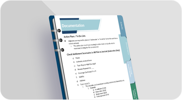 A ut Documentation hor i t y Action Plans / To Do Lists • Adjusters are required to place an “action plan” or “to do list” in the file each time a note is entered. o The action plan must have meaningful action items to include what is D D necessary to bring the file to conclusion oc ocum um e ent n Check Settlement Summaries in All Files to Include (Indemnity Only): t a at t i i on a) Payee on b) Authority received from: c) Type: Regular Mail/Overnight d) Reason: Payment for ____ R es F e) Coverage Confirmed: Y or N p i ons n f) Liability i an b c i i l al i g) Address: t i h) Total check: $ es i. This includes any breakdown including betterment, deductible, etc. 1. Example: a) Iv estimate $1500 b) Deductible: $500 c) Betterment: $250 T d) Total payment: $750 D i ea m d el i l nes i nes s & C us t om C l i er ent D & et 27 a i l Confidential, Proprietary and Trade Secret Document of NARS and protected by the Florida Uniform Trade s Secrets Act, chapter 688, Florida Statutes. No use allowed unless specifically authorized.