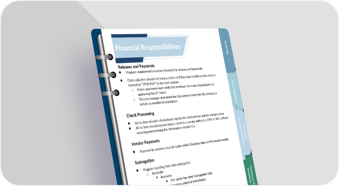 A ut Financial Responsibilities hor i t y Releases and Payments • Program requirements must be followed for releases and payments. • Claim adjusters should not issue a check until they have confirmed the check is marked as “STOP PAY” in the claim system. D o Check approvers must verify the previous check was stopped prior to oc nd um approving the 2 check. o The unit manager and above has the power to override this process, in ent certain as needed circumstances. a t i Check Processing on • At no time should a check issuer also be the check printer and/or mail processor • At no time should anyone issue a check to a vendor without a 1099 or W9, without R receiving and entering the information into the C3. Re ess FFin pp i onson Vendor Payments n anan is c bib ic i al ial lil i • Payment to vendors must be made within 5 business days of the invoice receipt. tit i esie Subrogation s • Program handling their own subrogation o Reminder Recovery • The carrier has their Subrogation Unit T D i ea m o Recognize subrogation potential immediately d el i o Utilize the subrogation referral form l nes i o Document the file notes with the subrogation referral nes s o Please make sure you submit it as soon as possible. Don’t wait & o Fire losses should immediately go to recovery – they will assist with experts etc… o We should receive a notice if the carrier subro rejects it o Alert the carrier subro team of closures etc… C us t NARS handling subrogation om C l i o Adjusters are required to identify subrogation potential as soon as possible er ent o Open subrogation module in the claim system as soon as subrogation is D & identified et 29 a i l Confidential, Proprietary and Trade Secret Document of NARS and protected by the Florida Uniform Trade s Secrets Act, chapter 688, Florida Statutes. No use allowed unless specifically authorized.