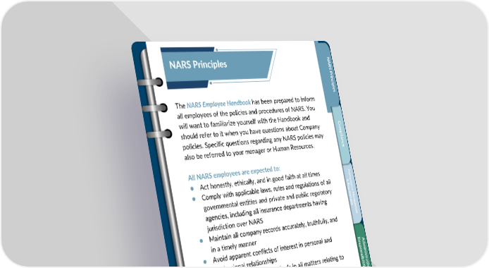 NAN NARS Principles RAR SS P P rr ininc c ipip ll ees The NARS Employee Handbook has been prepared to inform s all employees of the policies and procedures of NARS. You will want to familiarize yourself with the Handbook and should refer to it when you have questions about Company Co m pl policies. Specific questions regarding any NARS policies may i a n c also be referred to your manager or Human Resources. e All NARS employees are expected to: P ● Act honestly, ethically, and in good faith at all times er f or ● Comply with applicable laws, rules and regulations of all & Rm eqa n u c governmental entities and private and public regulatory i e M r ema enn agencies, including all insurance departments having a t g s em jurisdiction over NARS en ● Maintain all company records accurately, truthfully, and t in a timely manner ● Avoid apparent conflicts of interest in personal and R A esd professional relationships p m onsin ● Maintain the highest standards in all matters relating to i is b t r i a l t i accounting, financial controls t iv i ese ● Adhere to NARS policies, guidelines, and timelines ● Protect the confidentiality of NARS work product and proprietary information of NARS and our customers ● Promote a culture of honesty and accountability Y M oura Wn a orgi n 5 k g Confidential, Proprietary and Trade Secret Document of NARS and protected by the Florida Uniform Trade Secrets Act, chapter 688, Florida Statutes. No use allowed unless specifically authorized.