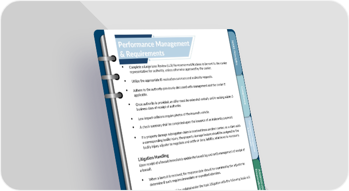 Performance Management NA R S P & Requirements r in c ip l e • Complete a Large Loss Review (LLR) for reserve modifications to be sent to the carrier s representative for authority, unless otherwise approved by the carrier. • Utilize the appropriate BI evaluation summary and authority requests. • Adhere to the authority previously discussed with management and the carrier if applicable. Co m pl • Once authority is provided, an offer must be extended verbally and in writing within 5 i a business days of receipt of authority. n c • Low impact collisions require photos of the insured’s vehicle. e • A check summary shall be completed upon the issuance of an indemnity payment. P er • If a property damage subrogation claim is received from another carrier, on a claim with f or a corresponding bodily injury, the property damage feature should be assigned to the & Rm eq a n u c bodily injury adjuster to negotiate and settle or deny liability, whichever is necessary. i e M r em a en n a Litigation Handling t g s em Upon receipt of a lawsuit immediately update the lawsuit log and notify management of receipt of en a lawsuit. t • When a lawsuit is received, the response date should be examined by the adjuster to determine if such requires immediate or expedited attention. R es A d • The file notes should be updated under the topic Litigation with the following basic suit p m onsin information. i is b t r • Case Number: i a l t i t iv i • Service Date: es e • County Filed: • Response Date: • Parties: • Demand Amount: • Once the file is updated to reflect that the suit was received, the adjuster shall send Y M oura documents to the designated email address for new lawsuits ([email protected] n ) and W a CC their unit manager. or gi n 13 k g Confidential, Proprietary and Trade Secret Document of NARS and protected by the Florida Uniform Trade Secrets Act, chapter 688, Florida Statutes. No use allowed unless specifically authorized.