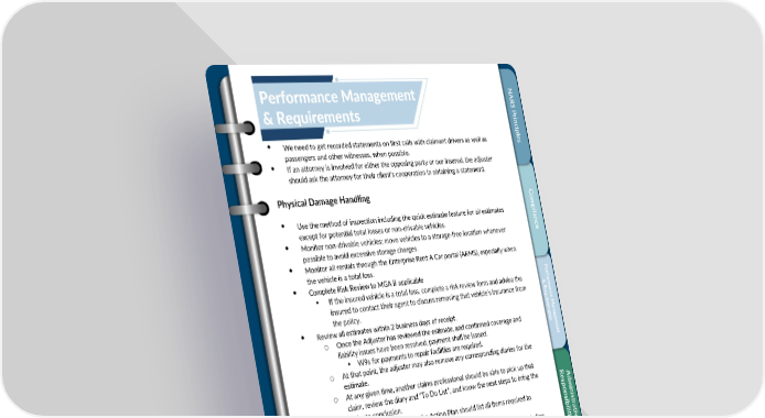 Performance Management NA R S P & Requirements r in c ip l e • We need to get recorded statements on first calls with claimant drivers as well as s passengers and other witnesses, when possible. • If an attorney is involved for either the opposing party or our insured, the adjuster should ask the attorney for their client’s cooperation in obtaining a statement. Physical Damage Handling Co m • Use the method of inspection including the quick estimate feature for all estimates pl i a except for potential total losses or non-drivable vehicles. n c • Monitor non-drivable vehicles; move vehicles to a storage-free location whenever e possible to avoid excessive storage charges. • Monitor all rentals through the Enterprise Rent A Car portal (ARMS), especially when the vehicle is a total loss. P • Complete Risk Review to MGA if applicable er f • If the insured vehicle is a total loss, complete a risk review form and advise the or & Rm insured to contact their agent to discuss removing that vehicle’s insurance from eq a n u c the policy. i e M r • Review all estimates within 2 business days of receipt. em a en n a o Once the Adjuster has reviewed the estimate, and confirmed coverage and t g s em liability issues have been resolved, payment shall be issued. en • W9s for payments to repair facilities are required. t o At that point, the adjuster may also remove any corresponding diaries for the estimate. o At any given time, another claims professional should be able to pick up that R claim, review the diary and “To Do List”, and know the next steps to bring the es A d claim to conclusion. p m • Create Action Plan (To do list) – the Action Plan should list all items required to onsin i is b t conclude the claim. r i a l t i • Adjusters must document the authorization of tows and advance charges, including t iv i es e negotiations, authority, in the file notes. Bodily Injury Handling • When there are injuries with a low impact, an inspection of both the insured and claimant’s vehicles should take place, regardless of whether there is physical damage Y M coverage or not. oura W n a or gi n 11 k g Confidential, Proprietary and Trade Secret Document of NARS and protected by the Florida Uniform Trade Secrets Act, chapter 688, Florida Statutes. No use allowed unless specifically authorized.