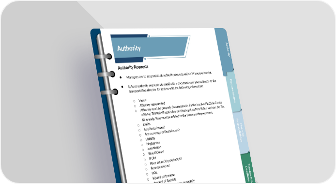 Aut uthA Authority rho o ity tyri Authority Requests • Managers are to respond to all authority requests within 24 hours of receipt. • Submit authority requests via email with a document over your authority to the coD transportation director for review with the following information: um o Venue ent o Attorney represented ioat o Attorney must be properly documented in Parties Involved in Claim Center n with No TIN Role if applicable or Attorney/Law Firm Role if we have the Tax ID already, Role must be related to the Exposure they represent. o Limits o Any limits issues? speR o Any coverage or limits issues? nsibiloinancF o Liability o Negligence ial o Jurisdiction sieit o Was ISO run? o If UM o Have we rec’d proof of UM o Reserve amount o DOL o Injured party name D imT o Amount of Specials e e o Breakout the lost wages separately inedlainel o Injuries ss • The original authority request from the adjuster should be forwarded to s & management with the manager’s recommendations. Settlement and Reserving Authority • Settlement and reserve authority is based up client handling instructions Cust oem ielC rD & nt 19 ileat Confidential, Proprietary and Trade Secret Document of NARS and protected by the Florida Uniform Trade s Secrets Act, chapter 688, Florida Statutes. No use allowed unless specifically authorized.