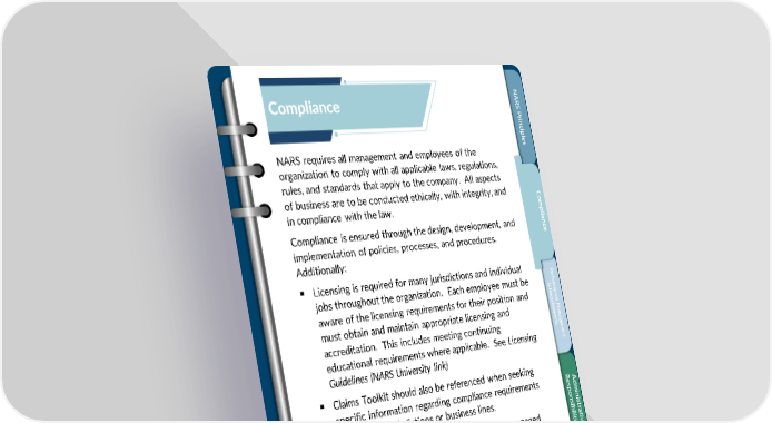 NAR Compliance r PS incipl NARS requires all management and employees of the es organization to comply with all applicable laws, regulations, rules, and standards that apply to the company. All aspects of business are to be conducted ethically, with integrity, and CC in compliance with the law. plompmo Compliance is ensured through the design, development, and iancncali implementation of policies, processes, and procedures. ee Additionally: ▪ Licensing is required for many jurisdictions and individual freP jobs throughout the organization. Each employee must be R&manor aware of the licensing requirements for their position and ueqec must obtain and maintain appropriate licensing and irmeeaM ntgna accreditation. This includes meeting continuing s mee educational requirements where applicable. See Licensing nt Guidelines (NARS University link) ▪ Claims Toolkit should also be referenced when seeking specific information regarding compliance requirements spRemAd with certain jurisdictions or business lines. onsibilstini ▪ All Data and Informational reporting must be managed itivrta and completed timely, accurately, and in accordance with ies e legal and regulatory standards and requirements. YuroMa Wgna 7 okr ing Confidential, Proprietary and Trade Secret Document of NARS and protected by the Florida Uniform Trade Secrets Act, chapter 688, Florida Statutes. No use allowed unless specifically authorized.