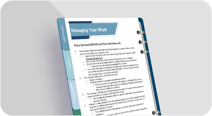 se iplincManaging Your Work rS P ARN Policy Demands (PDEM) and Time Limit Demands • The manager will receive the policy and time demands via email or they will be given to you if they are received via fax e o Upon receipt of a policy or time demand, please have the adjuster notify ianc [email protected] pl o Also, please notify the carrier immediately (Berkley as an example) mo o Review the evaluation immediately for additional necessary information ▪ Request that information from plaintiff’s counsel C o If no new information is required to evaluate the claim, the adjuster must review the specials and request authority within 5 business days to allow the manager time to review for authority t • The manager will need to verify the following: n o Nature of injuries megents o Confirm reserve is accurately modified to ultimate aan ▪ If the reserve is not appropriate the adjuster, will adjust the reserve M irmee or send a request to the carrier as a Large Loss Review (LLR) to have ecequ the reserve modified to ultimate man R • The manager will impose a self-timed response date of 2 weeks for the adjuster to rrfo& request authority or request additional information eP o This is regarding demands without a specific time frame requested by the attorney/claimant • If there is a time demand, then the response date is due to the manager for either authority or additional documentation 5 days prior to the time demand date set forth by the attorney/claimant e ies o This will allow time for the manager to review and request authority if ivatit necessary rst • The manager will need to set a calendar diary for the adjuster and for yourself to inionsibil ensure these dates are not missed mAdRespClaim Reviews with MGA and carrier • Managers are to ensure that their teams are fully prepared for claim reviews with MGAs, agents, insureds, and carriers. • Managers will be required to obtain the list of claims at least 1 - 2 week(s) prior to the review. o The list of claims is to be shared with the team, along with a blank Claim k Summary Template ingro • Adjusters must complete a Claim Summary Template for each of the claims on the g W presentation list and submit the Claim Summary Template to their respective naur manager at least 2 days prior to the claim review. MaYo 16 Confidential, Proprietary and Trade Secret Document of NARS and protected by the Florida Uniform Trade Secrets Act, chapter 688, Florida Statutes. No use allowed unless specifically authorized.
