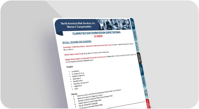 C T on able o North American Risk Services, Inc. t en ts f Workers’ Compensation CLAIMS FILE DOCUMENTATION EXPECTATIONS NARS W 14-DAYS a INITIAL – INTERIM- STATUS REPORT y U W Expectation: Initial Status Report is due by the 14th day from the date reported. Copy and paste the template into the nit MC C file and fill it in. anagr edo f Interim Status is due Day 30. Copy, paste and change what is necessary. eror s f Regular Status Reports are due every 45 days for lost time cases. Change what is needed, every 60 days for medical only orW and 90 days for permanent disability cases. SC C pecialistsr Template edo • Jurisdiction: • Summary of injury: P r acticB • Medical treatment: es est • Work status: • Benefits owed: • Disability management: U • Legal status: Checklistnit M • Goal: anag Strategy: er 1. Maintain contact with all parties (Ongoing: injured worker and employer) 2. Review/ Set reserves (Ongoing) (7 days) W ChecklistS 3. Manage medical to projected MMI date of (Target date) pecialist C Claims 4. Obtain release to work (Target Date) 5. Pay all related bills (Ongoing) 6. Settle/resolve the claim (Target Date) 14 DExpecta F a tionsile Pricing Evaluation and Negotiation Plan: y (Category: Resolution Plan, NOT status report) s • Pricing Evaluation and Negotiation Plan: • PPI Rating: Expecta • MSA: (Y or N) if yes, plan of action F • Reserves Appropriate: (Y or N) tionsile • Negotiation: • Explain numbers and rationale for negotiation. Also, explain clearly why an attorney negotiated the file instead of the specialist. R e f erD encisability e G uide CaN t o egt orieses and 18 19