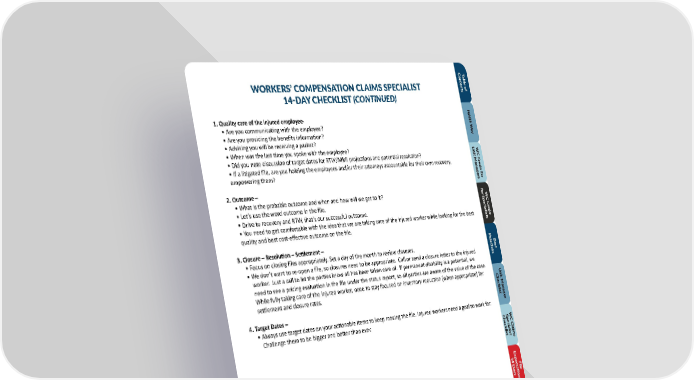 C T onable o t en WORKERS’ COMPENSATION CLAIMS SPECIALIST tsf 14-DAY CHECKLIST (CONTINUED) 1. Quality care of the injured employee- NARS W • Are you communicating with the employee? a • Are you providing the benefits information? y • Advising you will be receiving a packet? • When was the last time you spoke with the employee? U W • Did you note discussion of target dates for RTW/MMI projections and potential resolution? nit MC C anagr • If a litigated file, are you holding the employees and/or their attorneys accountable for their own recovery, edo f empowering them? er s or 2. Outcome – f • What is the probable outcome and when and how will we get to it? orW SC C • Let’s use the word outcome in the file. pecialistsr • Drive to recovery and RTW, that’s our successful outcome. edo • You need to get comfortable with the idea that we are taking care of the injured worker while looking for the best quality and best cost-effective outcome on the file. 3. Closure – Resolution – Settlement – P r acticB • Focus on closing files appropriately. Set a day of the month to review closures. esest • We don’t want to re-open a file, so closures need to be appropriate. Call or send a closure letter to the injured worker. Just a call to let the parties know all has been taken care of. If permanent disability is a potential, we need to see a pricing evaluation in the file under the status report, so all parties are aware of the value of the case. U While fully taking care of the injured worker, need to stay focused on inventory reduction (when appropriate) for Checklistnit M settlement and closure rates. anag 4. Target Dates – er • Always use target dates on your actionable items to keep moving the file. Injured workers need a goal to work for. Challenge them to be bigger and better than ever. W ChecklistS pecialist C Claims 14 DExpecta F a tionsile y s Expecta F tionsile R e f erD encisability e G uide Ca N t o eg t orieses and 10 11