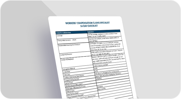 WORKERS’ COMPENSATION CLAIMS SPECIALIST 14-DAY CHECKLIST Initial File Collaboration Explanation Coverage Confirm coverage, employee and state is covered. In-force- Policy? Use your C3 policy search. Timely Initial Contacts – 3 Point If cannot make contacts, contact leader. MISSED CONTACT IS UNACCEPTABLE. Review Initial Investigation/Employer Confirmation of accident, injury and body part, witnesses, recorded statements, advise employer to stay in contact with employee. REQUEST WAGES AND JOB DESCRIPTION. Check injury codes, etc. for accuracy. Contact W/Provider If able, confirm description of injury/accident given, body part, last and next appt, and work status Contact W/Employee Recorded statement, confirm accident description, confirm lost time dates, confirm all body parts injured, last appt and next appt, explain expectations/benefits, document a profile, discuss RTW expectations and prior injuries Subrogation Referral Is there recovery potential? Jurisdiction Verify Class Code Verify Confirm Work Comp Type Mo/Ind. This should be changed on the summary screen. Compensability Decision Agree? Need any further investigation? Document. Losing Time? MARK FILE Medical Records Requested? Work Status Received/Confirmed RTW Screens Complete First Pay Due Date? Document file. Wage Statement Received? Benefits Calculated Correctly And Documented? Job Description Requested From Employer Job Description Sent To Provider Medical Treatment Plan/Fill In RTW Projection Form May not need or be able to use Surgery Form May not need or be able to use Need for SIU? Nurse Case Management Needed? Medicare? HICN ORM Assumption Completed? ISO Should be sent by outbound team. Initial Reserves Must outline most probable outcome Form Work Completed the initial form work? Be specific when needed. Reserving appropriate? Following handling instructions and do reserves accurately reflect exposure? Pay attention to initial reserves, ensuring it reflects exposure. 10 11