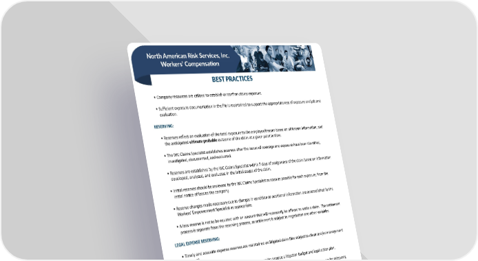 North American Risk Services, Inc. Workers’ Compensation BEST PRACTICES • Company resources are utilized to establish or confirm claims exposure. • Sufficient exposure documentation in the file is maintained to support the appropriateness of exposure analysis and evaluation. RESERVING: • Reserves reflect an evaluation of the total exposure to the employer/insurer based on all known information, and the anticipated ultimate probable outcome of the claim at a given point in time. • The WC Claims Specialist establishes reserves after the issues of coverage and exposure have been identified, investigated, documented, and evaluated. • Reserves are established by the WC Claims Specialist within 7 days of assignment of the claim based on information developed, analyzed, and evaluated in the initial stages of the claim. • Initial reserves should be reviewed by the WC Claims Specialist as soon as possible for each exposure, from the initial notice of loss to the company. • Reserve changes made necessary due to changes in condition or additional information are accomplished by the Workers’ Empowerment Specialist as appropriate. • A loss reserve is not to be equated with an amount that will necessarily be offered to settle a claim. The settlement process is separate from the reserving process, as settlement is subject to negotiation and other variables. LEGAL EXPENSE RESERVING: • Timely and accurate expense reserves are maintained on litigated claim files subject to client and/or management approval. • The WC Claims Specialist will request defense counsel to provide a litigation budget and legal action plan. • Throughout the life of the litigated file the WC Claims Specialist should review the expense reserve for adequacy, accuracy, and consistency with the approved litigation budget. • Paid litigated expenses should reduce the expense reserve in accordance with the litigation resolution plan and corresponding budget that has been approved. Any acceleration in paid expenses relative to the budget should trigger a review of the approved litigation budget for adequacy and accuracy and the budget proactively modified as required. DOCUMENTATION: • All notes to the file should strive to be objective, clear, concise, factual, and relevant to the claim. • The documentation and reporting allow the file to “speak for itself,” in a manner that tells the story of how the claim has progressed and is moving forward. NARS’ Best Practices were created by and for the internal use of NARS and are confidential, proprietary and trade secret documents protected by the Uniform Trade Secrets Act and applicable state/federal law. They may not be copied, distributed, or reproduced, in whole or in part, without NARS’ express prior written 6 authorization. Unauthorized use or distribution may be subject to civil and/or criminal penalties. 7
