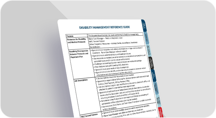 C T on able o t en DISABILITY MANAGEMENT REFERENCE GUIDE ts f Purpose This document summarizes key issues pertaining to disability management. NARS W Resources for Disability Nurse Case Manager – Field or telephonic nurse and Medical Protocols IME / Second Opinion a Other Programs / Resources – Activity Checks, Surveillance, Vocational y Rehabilitation U W Resolving Discrepancies • Specialist must recognize and address discrepancies in type and duration of nit MC C anagr Between Protocols and treatment. Nurse Case Manager referral needed? edo f Physician’s Plan • Specialist must understand injury and treatment issues. eror • Use resources as needed (see prior section) to comprehend complex/unusual/ s comorbid issues and/or communicate with provider. f orW • Challenges to treating physician must be based on medical knowledge SC C • Final decision rests with treating/IME physicians. pecialistsr • Specialist must post results of any discrepancies. edo • Specialist must also identify and resolve any discrepancies between verbal information and any subsequent written documents. P Job Descriptions • Job descriptions should be requested at case creation. r acticB • Specialist is responsible to follow up for job descriptions until received (Initial es est Contact, First Payment, 30 Day Review of file). • Job descriptions (regular and modified) must be sent to physician’s office and attached to patient’s chart before next appointment. U • Specialist should send cover letter/sheet with job descriptions, so provider Checklistnit M knows why the description was sent and fact that employer is committed to anag returning employee to work (modified and regular duty). er • Persistence is key if physician is not responsive (follow-up consisting of combination of fax and phone calls may be needed). W ChecklistS • Use resources (Field Nurse, Job Task Video) if employer unable to provide pecialist C Claims written description. IME/ Second Opinion • Specialist must select credible physician within appropriate specialty. • Nurse Case Manager and defense attorneys are resources. • Obtain necessary records, films and any other documentation needed prior to 14 DExpecta IME exam. F • Prioritize and summarize records for physician. a tionsile y • Specialist should ask specific questions, including those needed to address any s discrepancies between protocols and treating physician’s plans. RTW Adjustments • Specialist must maintain ongoing communication with employee after Expecta modified/TAW RTW. Partial disability is still a form of disability and specialist’s F obligation extends through regular duty RTW, even if no TPD is owed. tionsile Specialist must also adjust payment instructions to prevent improper payment of benefits. R e • If the employer does not have TAW and the jurisdiction allows, the case f erD handler should look to involve transitional work. encisability e G continued on page 28 uide CaN t o egt orieses and 26 27