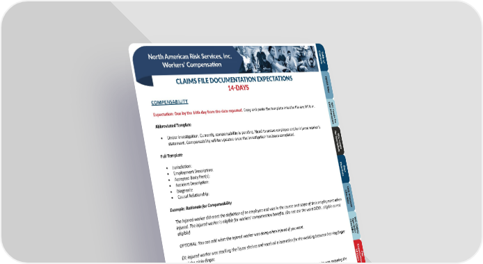 C T on able o North American Risk Services, Inc. t en ts f Workers’ Compensation CLAIMS FILE DOCUMENTATION EXPECTATIONS NARS W 14-DAYS a COMPENSABILITY y U W Expectation: Due by the 14th day from the date reported. Copy and paste the template into the file and fill it in. nit MC C anagr Abbreviated Template edo f eror • Under investigation: Currently, compensability is pending. Need to secure employer and/or injured worker’s s f statement. Compensability will be updated once the investigation has been completed. orW SC C Full Template pecialistsr edo • Jurisdiction: • Employment Description: • Accepted Body Part(s): P r acticB • Accident Description: es est • Diagnosis: • Causal Relationship: U Example: Rationale for Compensability Checklistnit M The injured worker did meet the definition of an employee and was in the course and scope of their employment when anag injured. The injured worker is eligible for workers’ compensation benefits. (Do not use the word DENY…eligible or not er eligible) ChecklistSW OPTIONAL: You can add what the injured worker was doing when injured if you want. pecialist C Claims EX: Injured worker was stocking the liquor shelves and received a laceration for the webbing between her ring finger and the pinky finger. Two examples: 14 DExpecta F a tionsile This file is eligible for benefits under workers’ compensation. The injured worker is a janitor who was mopping the y school floors when she turned and heard a pop in her back, sustaining a low back injury to the L5-S1 level. As the s injured worker was in the course and scope of her employment with Brookview Elementary by performing janitorial duties on-site, this file is accepted as compensable under Nebraska Workers’ Compensation. Expecta F This file is not eligible for benefits under Iowa jurisdiction based upon the idiopathic condition as the injured worker tionsile fainted while walking down the hallway at work. The syncopal episode is related to the injured worker’s health condition and not her employment. The file is not eligible for workers’ compensation benefits under Iowa Workers’ Compensation. R e f er D *If the employee is not eligible for benefits, please make sure there is authority from a leader on file to notify of the encisability ineligibility of benefits. e G uide CaN t o egt orieses and 16 17