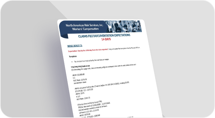 North American Risk Services, Inc. Workers’ Compensation CLAIMS FILE DOCUMENTATION EXPECTATIONS 14-DAYS WAGE BENEFITS Expectation: Due by the 14th day from the date reported. Copy and paste the template into the file and fill it in. Templates • For incident or medical only: No lost time or wages. TTD/TPD/PPD/Settlement If estimating the wage rate, document and justify the estimated rate with the calculation in the note AWW: $1,000.00 S-1 W/C Rate: $674.00 Jurisdiction: Iowa AWW calculated taking the 13 weeks before the DOI (04/14/2020), totaling $7,475. $7,474.00 / 13 = $575.00 AWW: $575 X 2/3 W/C Rate: $383.33 If losing time and being issued TPD: TPD for the week of 11/01/2020 – 11/07/2020: Injured worker worked a total of 14 hours. 14 hours x $15.00 = $210.00 AWW: $575.00 $575.00 - $210.00 = $365.00 $365.00 x 2/3 = $243.33 TPD issues for the week of 11/01/2020 – 11/07/2020 in the amount of $383.33. TPD is set for the next six weeks (11/01/2020 – 12/12/2020) for the weekly amount of $383.33. PPD is being issued for the impairment to the right shoulder because of the arthroscopic surgery. Impairment total 5%; 5% x 250 weeks = 12.5 weeks x $674.00 = $8,425.00. PPD is issued from 05/08/2020 to 08/03/2020 for 12.5 weeks of benefits at $674.00. *Were statutory defenses considered – for example, safety infractions. (Jurisdictionally specific) **Attach documentation! 18 19