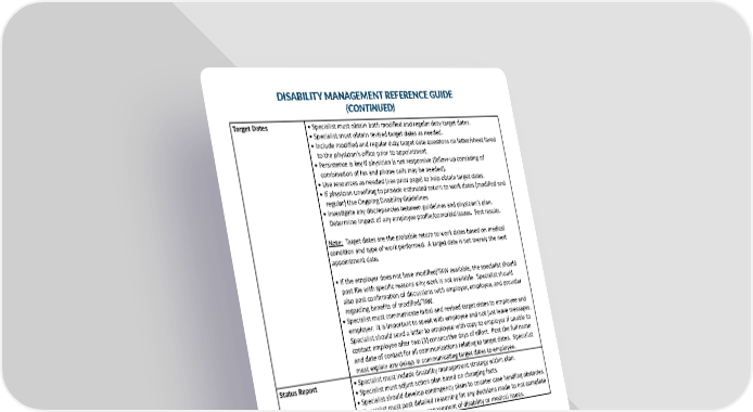 DISABILITY MANAGEMENT REFERENCE GUIDE (CONTINUED) Target Dates • Specialist must obtain both modified and regular duty target dates. • Specialist must obtain revised target dates as needed. • Include modified and regular duty target date questions on letter/sheet faxed to the physician’s office prior to appointment. • Persistence is key if physician is not responsive (follow-up consisting of combination of fax and phone calls may be needed). • Use resources as needed (see prior page) to help obtain target dates. • If physician unwilling to provide estimated return to work dates (modified and regular) Use Ongoing Disability Guidelines • Investigate any discrepancies between guidelines and physician’s plan. Determine impact of any employee profile/comorbid issues. Post results. Note: Target dates are the probable return to work dates based on medical condition and type of work performed. A target date is not merely the next appointment date. • If the employer does not have modified/TAW available, the specialist should post file with specific reasons why work is not available. Specialist should also post confirmation of discussions with employer, employee, and provider regarding benefits of modified/TAW. • Specialist must communicate initial and revised target dates to employee and employer. It is important to speak with employee and not just leave messages. Specialist should send a letter to employee with copy to employer if unable to contact employee after two (3) consecutive days of effort. Post the full name and date of contact for all communications relating to target dates. Specialist must explain any delays in communicating target dates to employee. Status Report • Specialist must include disability management strategy within plan. • Specialist must adjust action plan based on changing facts. • Specialist should develop contingency plans to counter case handling obstacles. • Specialist must post detailed reasoning for any decisions made to not complete specific tasks relating to management of disability or medical issues. 28 29