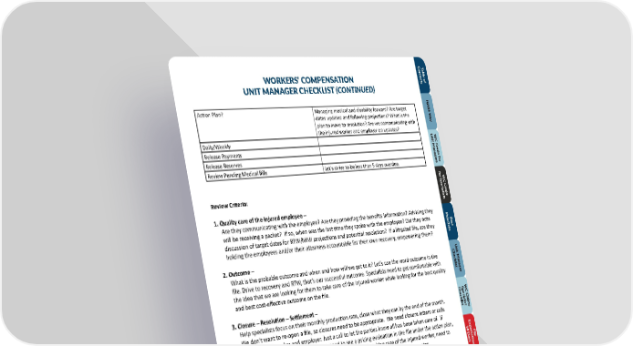 C T onable o t en WORKERS’ COMPENSATION tsf UNIT MANAGER CHECKLIST (CONTINUED) Action Plan? Managing medical and disability forward? Are target NARS W dates updated and following projections? What is the a plan to move to resolution? Are we communicating with y the injured worker and employer on updates? UW Daily/Weekly nit MC C Release Payments anagr Release Reserves edo f eror Review Pending Medical Bills Let’s strive to be less than 5 days overdue. s f orW SC C pecialistsr Review Criteria: edo 1. Quality care of the injured employee – Are they communicating with the employee? Are they providing the benefits information? Advising they P r will be receiving a packet? If so, when was the last time they spoke with the employee? Did they note acticB discussion of target dates for RTW/MMI projections and potential resolution? If a litigated file, are they esest holding the employees and/or their attorneys accountable for their own recovery, empowering them? U 2. Outcome – Checklistnit M What is the probable outcome and when and how will we get to it? Let’s use the word outcome in the file. Drive to recovery and RTW, that’s our successful outcome. Specialists need to get comfortable with anag the idea that we are looking for them to take care of the injured worker while looking for the best quality er and best cost-effective outcome on the file. ChecklistSW 3. Closure – Resolution – Settlement – pecialist C Claims Help specialists focus on their monthly production rate, close what they can by the end of the month. We don’t want to re-open a file, so closures need to be appropriate. We need closure letters or calls to the injured worker and employer. Just a call to let the parties know all has been taken care of. If permanent disability is a potential, we need to see a pricing evaluation in the file under the action plan, 14 DExpecta so all parties are aware of the value of the case. While fully taking care of the injured worker, need to F a tionsile stay focused on inventory reduction (when appropriate) for settlement and closure rates. y s 4. Target Dates – Do not be afraid to post a date you expect them to accomplish something…accountability. Injured Expecta workers need a goal to work for. Challenge them to be bigger and better than ever. F tionsile R e f erD encisability e G uide CaN t o egt orieses and 8 9