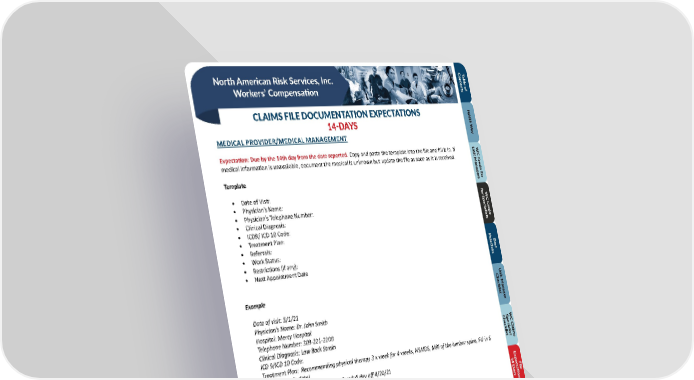 C T onable o North American Risk Services, Inc. t en tsf Workers’ Compensation CLAIMS FILE DOCUMENTATION EXPECTATIONS NARS W 14-DAYS a MEDICAL PROVIDER/MEDICAL MANAGEMENT y U W Expectation: Due by the 14th day from the date reported. Copy and paste the template into the file and fill it in. If nit MC C medical information is unavailable, document the medical is unknown but update the file as soon as it is received. r anagedo f Template eror s • Date of Visit: f orW • Physician’s Name: SC C • Physician’s Telephone Number: pecialistsr • Clinical Diagnosis: edo • ICD9/ ICD 10 Code: • Treatment Plan: • Referrals: P r • Work Status: acticB • Restrictions (if any): esest • Next Appointment Date U Example Checklistnit M Date of visit: 5/1/21 anag er Physician’s Name: Dr. John Smith Hospital: Mercy Hospital Telephone Number: 309-221-2200 ChecklistSW Clinical Diagnosis: Low Back Strain pecialist C Claims ICD 9/ICD 10 Code: Treatment Plan: Recommending physical therapy 3 x week for 4 weeks, NSAIDS, MRI of the lumbar spine, FU in 6 weeks (include date). Work Status: Completely off work, first full day off 4/20/21 14 DExpecta Restrictions: No work F Next Appt. Date: 5/15/21 a tionsile y *ATTACH MEDICAL RECORD TO NOTE. s Expecta F tionsile R e f erD encisability e G uide CaN t o egt orieses and 14 15