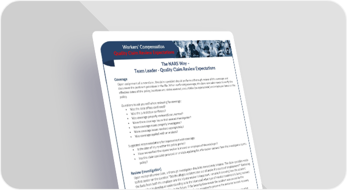 Workers’ Compensation Quality Claim Review Expectations The NARS Way – Team Leader - Quality Claim Review Expectations Coverage Upon assignment of a new claim, the claim specialist should perform a thorough review of the coverage and document the pertinent provisions in the file. When confirming coverage, the claim specialist needs to verify the effective dates of the policy, locations and states covered; deductibles (as appropriate) and employee listed on the policy. Questions to ask yourself when reviewing for coverage: • Was the date of loss confirmed? • Was the jurisdiction confirmed? • Was coverage properly reviewed/documented? • Were there coverage issues that needed investigation? • Were coverage issues properly investigated? • Were coverage issues resolved appropriately? • Was coverage applied with an analysis? Suggested recommendations for improvement with coverage: • Is the date of injury within the policy period? • Have we verified the injured worker is indeed an employee of the employer? • Has the claim specialist provided an analysis applying the information secured from the investigation to the policy? Review (Investigation) Upon receipt of a new claim, a thorough investigation should be immediately initiated. The claim specialist needs to first center on the question “Did the alleged accident arise out of and in the course of employment?” Gathering the facts from both the employer and the injured worker is important, not only in knowing how the accident occurred but to develop an understanding as to the injury and what type of medical treatment is being received presently and potentially will be in the future. If the investigation reveals the accident was caused by the negligence of others, it is essential the claim specialist be proactive to preserve the evidence to seek recovery against the third party. There is always the necessity to consider each loss individually and to exercise sound judgement as to what investigation is needed for a particular claim. Additional effort may be needed on more complex and serious losses. In those claims where the injured worker is reported to have suffered lost time because of the accident, the claim specialist needs to secure a recorded statement in a timely manner. (Recorded statements need to be obtained on all lost time, questionable, and subrogation claims in addition to client specific instructions.) Questions to ask yourself while reviewing for investigation: • Were the facts of the accident/injury gathered and documented? • Were recorded statements taken and documented? • Was an assessment of compensability accurate and clearly documented? (Clearly documenting how the injury related to the injured worker’s’ occupation, state jurisdiction, and applicability to the work.) • Was the first full day off and first date of disability documented? NARS’ Best Practices were created by and for the internal use of NARS and are confidential, proprietary and trade secret documents protected by the Uniform Trade Secrets Act and applicable state/federal law. They may not be copied, distributed, or reproduced, in whole or in part, without NARS’ express prior written authorization. Unauthorized use or distribution may be subject to civil and/or criminal penalties.