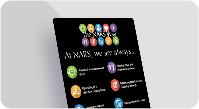 At NARS, we are always... Keeping it fun and Fanatical about response celebrating victories times Operating as a Setting expectations and high-functioning team following through Holding ourselves Taking pride in our work accountable Treating everyone with Dedicated to continuous respect and empathy improvement Proactive in seeking Delivering what is solutions important to our stakeholders