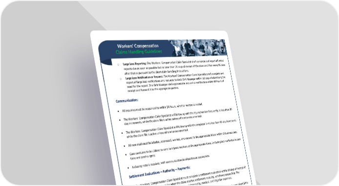 Workers’ Compensation Claims Handling Guidelines o Large Loss Reporting: The Workers' Compensation Claim Specialist shall complete and report all Initial reports due as soon as possible but no later than 30 days of receipt of the claim and then every 90 days after that or pursuant to the client claim handling instructions. o Large Loss Notification or Request: The Workers' Compensation Claim Specialist shall complete and report all large loss notifications and requests to their Unit Manager within 10 days of identifying the need for the report. The Unit Manager shall approve the request or notification within 48 hours of receipt and forward it to the appropriate parties. Communication: • All inquiries must be responded to within 24 hours, whether written or verbal. • The Workers' Compensation Claim Specialist will follow up with the injured worker frequently, in less than 30- day increments, while the claim file is active unless otherwise documented. • The Workers' Compensation Claim Specialist will follow up with the employer in no less than 45-day increments while the claim file is active unless otherwise documented. • All new mail must be labeled, addressed, worked, and moved to the appropriate folder within 3 business days. • Care cards are to be utilized to send to injured workers at the appropriate times, including but not limited to lost time and post-surgery. • A closing note is required, with communication to all parties as appropriate. Settlement Evaluations – Authority – Payments: • The Workers' Compensation Claim Specialist must complete a settlement evaluation within 10 days of receipt of any settlement demand and/or when the claim reaches settlement maturity, whichever comes first. The evaluation must be detailed, accounting for future indemnity, medical, and litigation expenses. • The Workers' Compensation Claim Specialist will request settlement authority from their leader and client if the amount needed is more than the individual's authority limits. The Workers' Compensation Claim Specialist should document the method and/or calculation required to support the settlement evaluation. At that time, the Workers' Compensation Claim Specialist will message the leader and client that authority is needed. The Unit Manager and client's approval should be documented in the file notes, or when required, the Unit Manager should inform the Director. • The Workers' Compensation Claim Specialist will document the file and follow a detailed and appropriate negotiation strategy. • The Workers' Compensation Claim Specialist will issue settlement payments within 2 business days from the receipt of notice of approval. This document contains North American Risk Services – Workers’ Compensation proprietary information that is privileged and confidential. It is to be used exclusively by the individual to whom it was given and is not to be copied in full or in partial or the information herein communicated in any manner to anyone who is not employed by North American Risk Services.