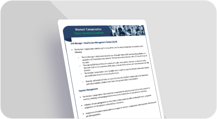 Workers’ Compensation Claims Handling Guidelines Unit Manager – Quality Case Management Review (QCM) • The Workers' Compensation Unit Manager's review of the claim file should include but not be limited to the following: o The Unit Manager's initial review must include a thorough review of all claims handling guidelines and completion of C3 mandatory requirements. The first review should be done within 15 days of receipt of the claim. o The ongoing QCM should follow the severity of a claim, medical only, indemnity, or permanent total. Then note must include a summary of the status, a review of the reserves, and recommendations for file direction. o The Workers' Compensation Claim Specialist should submit all Large Loss Reports, Reinsurance Reports, and notifications to clients to leadership for review. o Reserves, settlement authority, and payments above the Workers' Compensation Claim Specialist's authority should be submitted to the leader for approval before implementation. Expense Management: • The Workers' Compensation Claim Specialist is responsible for exercising reasonable business judgment in selecting, retaining, and managing external resources to facilitate fair and prompt claims resolution. • Utilization of case management must be clearly outlined in the claim file identifying the need, purpose for assignment, and the outcome anticipated by involvement. • Assignments of outside strategic partners are up to the Workers' Compensation Claim Specialist's discretion and per client guidelines. This document contains North American Risk Services – Workers’ Compensation proprietary information that is privileged and confidential. It is to be used exclusively by the individual to whom it was given and is not to be copied in full or in partial or the information herein communicated in any manner to anyone who is not employed by North American Risk Services.