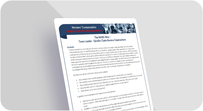 Workers’ Compensation Quality Claim Review Expectations The NARS Way – Team Leader - Quality Claim Review Expectations Contacts Prompt contact is an essential part of good customer service and proper claims handling. From the limited information provided on the First Report of Injury, Workers’ Compensation Claim specialists can expand their understanding of the events surrounding the accident during this initial voice to voice contacts. With timely voice to voice contact within a short period of time after the receipt of the claim, the claim specialist can obtain a sense of the employee’s injuries arising out of and in the course of their employment. During this initial contact, the claim specialist needs to fully explain the applicable Workers’ Compensation benefits to the injured employee and the claim specialist role throughout the process. This should place the employee at ease, knowing (and understanding) what benefits are provided to address the financial exposure of the incurred medical expenses and loss of potential wages. Explanation of other benefits, such as mileage, should also be explained. Questions to ask yourself while reviewing for contacts: • Was contact made with the employer within 8 hours on the date the claim was reported? • Was contact made with the injured worker on the date the claim was assigned or within 8 hours of receipt? • Were initial contact efforts timely? (One time per day: hourly is excessive…four days is too much) • Were benefits and the claims process properly explained to the injured worker? • Were follow-up contacts appropriate? Suggested recommendations for improvement with contacts: • Attempt to make voice to voice contact with the employer and the injured worker on the same day the claim is reported. If the initial attempt is unsuccessful, try again the next day and include a text and/or email. • Establish an activity for timely follow up of the initial attempt and subsequent contacts. • Document all contact attempts in the claim file either the day it is accomplished or the next day. Do not allow days or weeks to pass prior to documenting contacts. • Regarding reassigned claims, have the claim specialist contact the injured worker and the employer within three days. Communication • Did the specialist communicate with the injured worker monthly while off work? • Did the specialist communicate with the injured worker to discuss significant changes, throughout the life of the claim? • Did the specialist communicate with the employer to discuss significant changes, throughout the life of the claim? • Did the specialist send a card or flowers during the life of the claim, when applicable? NARS’ Best Practices were created by and for the internal use of NARS and are confidential, proprietary and trade secret documents protected by the Uniform Trade Secrets Act and applicable state/federal law. They may not be copied, distributed, or reproduced, in whole or in part, without NARS’ express prior written authorization. Unauthorized use or distribution may be subject to civil and/or criminal penalties.