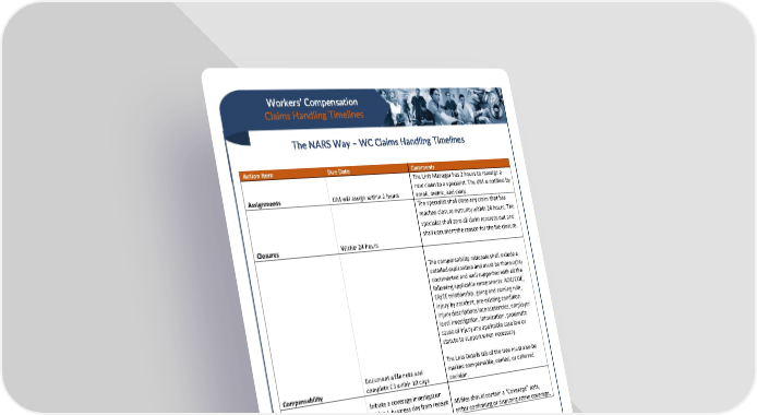 Workers’ Compensation Claims Handling Timelines The NARS Way – WC Claims Handling Timelines Action Item Due Date Comments The Unit Manager has 2 hours to reassign a new claim to a specialist. The UM is notified by Assignments UM will assign within 2 hours email, metric, and diary. The specialist shall close any claim that has reached closure maturity within 24 hours. The specialist shall zero all claim reserves out and shall document the reason for the file closure. Closures Within 24 hours The compensability rationale shall include a detailed explanation and must be thoroughly documented and well supported with all the following applicable components: AOE/COE, ER/EE relationship, going and coming rule, injury by accident, pre-existing condition, injury descriptions inconsistencies, employer level investigation, intoxication, proximate cause of injury any applicable case law or statute to support when necessary. The Loss Details tab of the tree must also be Document a file note and marked compensable, denied, or deferred Compensability complete C3 within 10 days decision. Initiate a coverage investigation within 1 business day from receipt All files should contain a “Coverage” note, Coverage of claim. Max 3 days. either confirming or disputing active coverage. NARS’ Best Practices were created by and for the internal use of NARS and are confidential, proprietary and trade secret documents protected by the Uniform Trade Secrets Act and applicable state/federal law. They may not be copied, distributed, or reproduced, in whole or in part, without NARS’ express prior written authorization. Unauthorized use or distribution may be subject to civil and/or criminal penalties.