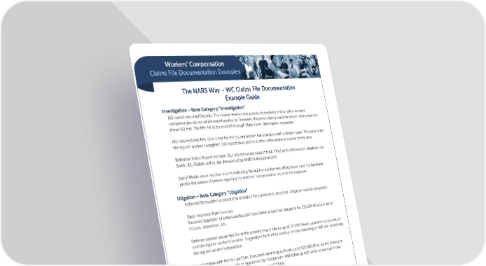 Workers’ Compensation Claims File Documentation Examples The NARS Way – WC Claims File Documentation Example Guide BEST PRACTICES Investigation – Note Category “Investigation” ISO report returned five hits. The injured worker was previously involved in four other workers’ compensation claims which were handled by Travelers. Request is being made to obtain information for these ISO hits. The fifth hit is for an MVA through State Farm. Information requested. ISO returned two hits. One is not for the injured worker but someone with a similar name. The other is for the injured worker’s daughter. ISO report okay and no further information is needed at this time. Belleview Police Report received. Our injured worker was at fault. Third party information obtained: Joe Smith, 43, Allstate policy, etc. Forwarded to NARS Subrogation Unit. Social Media scrub resulted in a hit indicating the injured worker was skiing based upon his Facebook profile the weekend before reporting his workers’ compensation injury to his employer. Litigation – Note Category “Litigation” Referred file to defense counsel to include a file summary as attached. Litigation module completed. Upon response from Counsel: Received legal plan of action and budget from Defense Counsel. Budget is for $25,000.00 and is set to include: deposition, etc. Defense counsel values this file at the present time in the range of 20-30% based upon the injury's nature and the injured worker's location. Suggestions for further workup include obtaining an IME and scheduling the injured worker's deposition. Legal review with Pernie Law Firm. Discussed extending authority up to $25,000.00 as we are looking to resolve this Iowa claim with an Agreement for Settlement. Will follow up with defense counsel in two weeks to determine the status of settlement negotiations. Managerial Notes – Note Category “Managerial Notes” Separate guide for Workers' Compensation Unit Managers - Quality Claim Management Review. Summary: This is a low-risk claim for a finger laceration. Compensability has been accepted and appears it is a one-time treat with release. Lost time within the waiting period. Reserves: Reserves are adequate for the exposure. Recommendations: Please follow up for the release documentation and put on diary to close once bills are paid. NARS’ Best Practices were created by and for the internal use of NARS and are confidential, proprietary and trade secret documents protected by the Uniform Trade Secrets Act and applicable state/federal law. They may not be copied, distributed, or reproduced, in whole or in part, without NARS’ express prior written authorization. Unauthorized use or distribution may be subject to civil and/or criminal penalties.