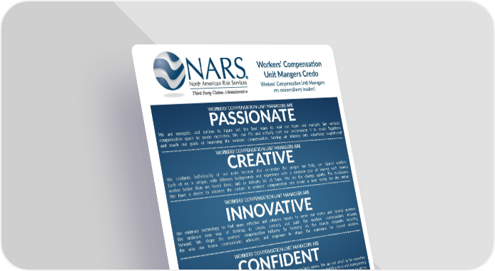Workers’ Compensation Unit Mangers Credo Workers’ Compensation Unit Managers are extraordinary leaders! WORKERS’ COMPENSATION UNIT MANAGERS ARE PASSIONATE We are energetic and curious to figure out the best ways to lead our team and navigate the workers’ compensation space to exude excellence. We love life and actively craft our environment it to create happiness and reach our goals of improving the workers’ compensation, turning an industry into something magnificent! WORKERS’ COMPENSATION UNIT MANAGERS ARE CREATIVE We celebrate individuality of our team because that celebrates the people we help, our injured workers. Each of us is unique, with different backgrounds and experience with a common goal of leaving each injured worker better than we found them, and an industry full of hope. We are the change agents. The trailblazers. We have a desire to advance the culture in workers’ compensation and create a new reality for the future. WORKERS’ COMPENSATION UNIT MANAGERS ARE INNOVATIVE We embrace technology to find more effective and efficient means to serve our teams and injured workers. We embrace new way of thinking to create, connect, and push the workers’ compensation industry forward. We shape the workers’ compensation industry by focusing on the human elements including the way our teams communicate, advocate, and empower to shape the outcomes for injured workers. WORKERS’ COMPENSATION UNIT MANAGERS ARE CONFIDENT We know who we are, and we allow our team to thrive by being their very best selves. We are not afraid to be ourselves because the more authentic we can be the better work we can do to help injured workers by building trust and transparency throughout the workers’ compensation journey. We do not follow trends; we create them. We inspire for others to thrive. WORKERS’ COMPENSATION UNIT MANAGERS ARE DETERMINED We are focused on making good things happen for people and persistent in following through with what we say we are going to do. We help our teams push through fears to help injured workers with the unknown to emphasize the importance of being a recovery team. We understand failure is just a pathway to success to continue to move the workers’ compensation industry forward. WORKERS’ COMPENSATION UNIT MANAGERS ARE KIND We are ambitious and driven to make good things happen for our teams, injured workers, and the industry. We use our power to empower others. Together we can shake up the workers’ compensation world. We understand the ripple effect and how each decision, each encounter, each conversation impacts the greater whole.