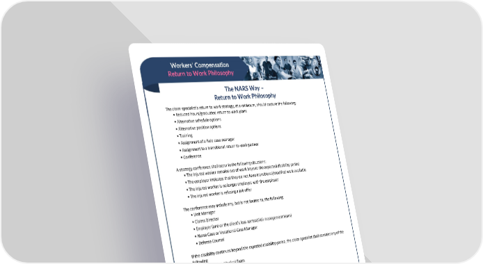 Workers’ Compensation Return to Work Philosophy The NARS Way – Return to Work Philosophy The claim specialist's return to work strategy, at a minimum, should capture the following: • Reduced hours/graduated return to work plans • Alternative schedule options • Alternative position options • Training • Assignment of a field case manager • Assignment to a transitional return to work partner • Conference A strategy conference shall occur in the following situations: • The injured worker remains out of work beyond the expected disability period • The employer indicates that they do not have transitional/modified work available • The injured worker is no longer employed with the employer • The injured worker is refusing a job offer The conference may include any, but is not limited to, the following: • Unit Manager • Claims Director • Employer (and or the client's loss control/risk management team) • Nurse Case or Vocational Case Manager • Defense Counsel If the disability continues beyond the expected disability period, the claim specialist shall consider any of the following: • Independent Medical Exam • Functional Capacity Evaluation • When allowed, request a referral to a new treating physician • Consider vocational assessments • Peer-to-peer review NARS’ Best Practices were created by and for the internal use of NARS and are confidential, proprietary and trade secret documents protected by the Uniform Trade Secrets Act and applicable state/federal law. They may not be copied, distributed, or reproduced, in whole or in part, without NARS’ express prior written authorization. Unauthorized use or distribution may be subject to civil and/or criminal penalties.