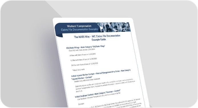 Workers’ Compensation Claims File Documentation Examples The NARS Way – WC Claims File Documentation Example Guide BEST PRACTICES EDI/State Filings – Note Category “EDI/State Filings” Filed FROI with State of Iowa 11/08/2020. IP filed with State of Iowa on 11/10/2020. S1 filed with State of Iowa on 11/14/2020. FN filed with State of Iowa on 11/30/2020. *Attach document. Initial Injured Worker Contact – Medical Management Only Claims – Note Category “Injured Worker – Contact” Medical only with treat/release treatment: Called the injured worker and introduced myself as the contact for any future needs related to this workers' compensation claim. Provided my contact information. I also sent a letter with the employee brochure. Initial Employer Contact –Note Category “Employer – Contact” Use Employer Interview Template and document a summary to the file: Example: Contacted Wayne Skull, WC Contact for KBL Design Center. He confirmed the IW's supervisor. He does not directly supervise the IW but confirmed the hire date as 1/1/2005. He also confirmed he is a light installer/technician and does not question the injury. He confirmed his wages of $25/hour, 8 hours per day, and no more than 40 hours per week. He did pay him for his two days of lost time and confirmed the lost time days of 7/23 & 7/24. RTW full duty on 7/25. He does have the box cutter and confirms there is nothing defective with the box cutter. He prefers we communicate with the IW's supervisor, Matt Gibson, throughout the life of the claim. Contacted Matt Gibson, IW's supervisor. He confirmed the incident description, picked the injured worker up, and drove him to the emergency room. He also took the box cutter and confirmed no defects. The injured worker did not use the device properly and was not paying attention. He confirmed the location of the incident and did not have any reason to question the incident. He prefers we do not contact the customer regarding the details. He is aware of the next office visit on 8/1, and they will pay the IW to attend the appointment. He prefers to communicate by text also, and his number is 123-456-7899. I asked if he had completed an internal supervisor form for the accident, and he did. He will forward it to our file. NARS’ Best Practices were created by and for the internal use of NARS and are confidential, proprietary and trade secret documents protected by the Uniform Trade Secrets Act and applicable state/federal law. They may not be copied, distributed, or reproduced, in whole or in part, without NARS’ express prior written authorization. Unauthorized use or distribution may be subject to civil and/or criminal penalties.