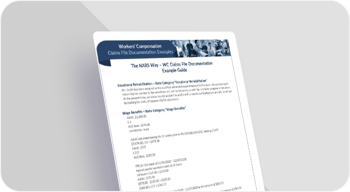 Workers’ Compensation Claims File Documentation Examples The NARS Way – WC Claims File Documentation Example Guide BEST PRACTICES Vocational Rehabilitation – Note Category “Vocational Rehabilitation” Mr. Smith has been assigned as the qualified rehabilitation professional to this claim. We are looking to return injured worker to the workforce and will be following up with Mr. Smith for progress in this arena. At the present time, we know injured worker has a GED with a mechanical background and Mr. Smith will be looking for areas of opportunity for placement. Wage Benefits – Note Category “Wage Benefits” AWW: $1,000.00 S-1 W/C Rate: $674.00 Jurisdiction: Iowa AWW calculated taking the 13 weeks prior to the DOI (04/14/2020), totaling $7,475. $7,474.00 / 13 = $575.00 AWW: $575 X 2/3 W/C Rate: $383.33 TPD for the week of 11/01/2020 – 11/07/2020: Injured worker worked a total of 14 hours. 14 hours x $15.00 = $210.00 AWW: $575.00 $575.00 - $210.00 = $365.00 $365.00 x 2/3 = $243.33 TPD issues for the week of 11/01/2020 – 11/07/2020 in the amount of $383.33. TPD set for the next six weeks (11/01/2020 – 12/12/2020) for the weekly amount of $383.33. PPD is being issued for the impairment to the right shoulder because of the arthroscopic surgery. Impairment total 5%; 5% x 250 weeks = 12.5 weeks x $674.00 = $8,425.00. PPD is being issued from 05/08/2020 to 08/03/2020 for 12.5 weeks of benefits at $674.00. *Attach documentation! **If estimating the wage rate, document and justify the estimated rate with the calculation in the note. NARS’ Best Practices were created by and for the internal use of NARS and are confidential, proprietary and trade secret documents protected by the Uniform Trade Secrets Act and applicable state/federal law. They may not be copied, distributed, or reproduced, in whole or in part, without NARS’ express prior written authorization. Unauthorized use or distribution may be subject to civil and/or criminal penalties.